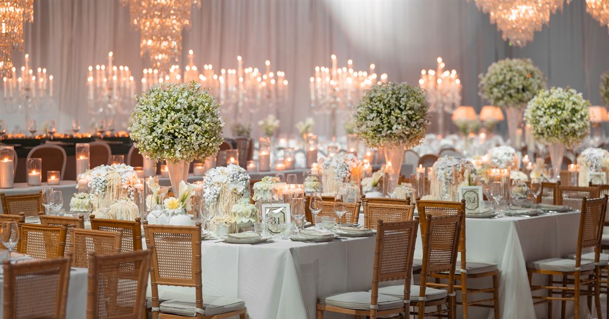 השולחנות עוטרו בסידורי פרחים לבנים ואציליים, לצד פמוטי קריסטל ואינספור נרות שיצרו אווירה רומנטית ואינטימית. בחירת הכיסאות והשימוש בטקסטורות כמו אבנים לבנות המקיפות שולחנות אבירים ארוכים, הדגישו את הקו העיצובי המוקפד.
